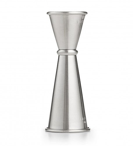 - One Double-Sided Jigger Striking in stainless steel, professional Japanese-style double jigger. A barware essential and a must-have. Markings at 1.5, 0.75, and 0.5 oz.