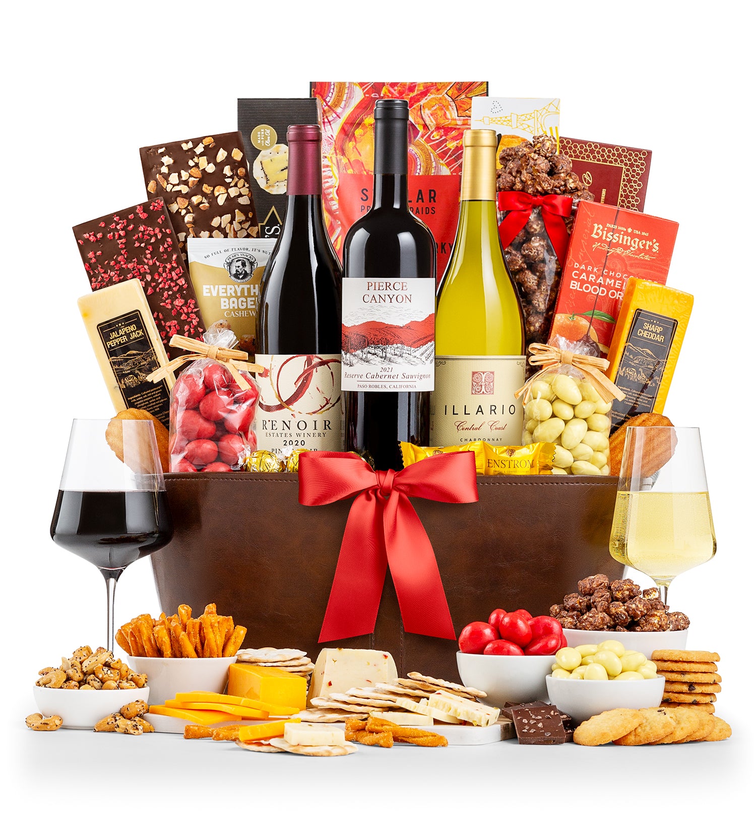 Our exclusive basket is filled to the brim with three bottles of wine along with perfect epicurean pairings.